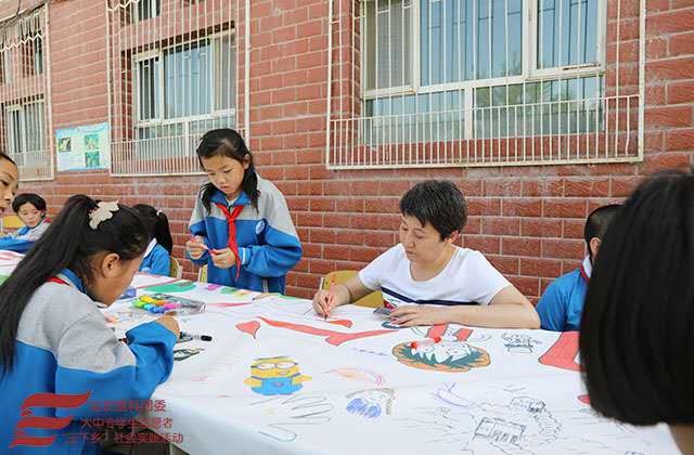 下午,实践团成员带领员工们在室外用彩笔描绘出自己心中梦想的家国。员工们所勾勒出的对自己家乡与国家的爱,感动了实践团成员,也激励着同学们奋发向上,为建设家乡和祖国而努力。