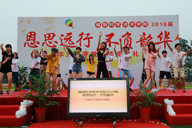 拳拳盛意,感莫可言;倾盖如故,相遇即缘。在毕业生走红毯,照片签名墙拍照进行的同时,一支美轮美奂的快闪舞蹈如约而至,随着简短开场白的结束,2018级开放式毕业典礼正式开始。典礼第一项,视频播放,美妙的音乐萦绕在耳际,映现出青涩脸颊洋溢的青春微笑;典礼第二项,优秀毕业生代表杨思锐上台发言,韵味无穷,洋洋盈耳,表达出同学之间的友谊之情与对老师的感恩之情;典礼第三项,2017级资环二班王越为2018级毕业生带来一支古典独舞,幽幽古典之情,超越喧嚣的古韵墨香。