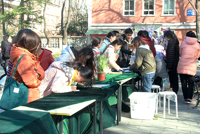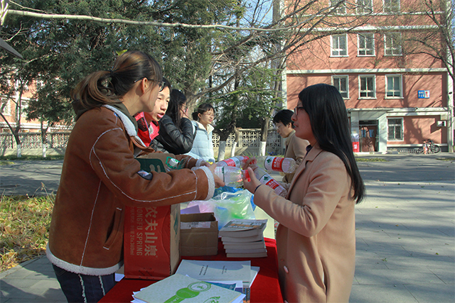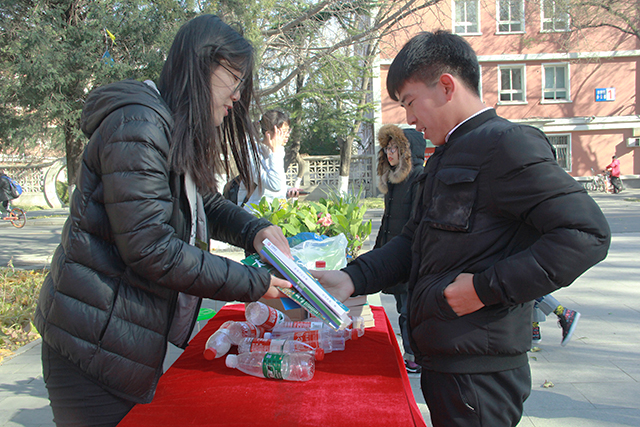 感恩换绿植活动中同学可以通过捐赠两本书或10个空瓶子来换取一张卡片,集齐两张卡片可在现场任选一盆绿植带走,同学们积极参与到活动当中。