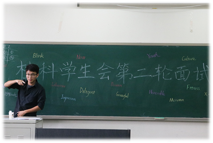 各部门面试题目大多与该部门未来的工作相关联,甚至有的部门采用实际考核的方式对大家的完成度进行评定。例如,新闻中心采用新闻制作的方法进行考核;外联和文艺部采用书写活动策划的方式进行考核。同学们十分认真,对所应聘的职位势在必得,让面试官们感受到了同学们的真诚。