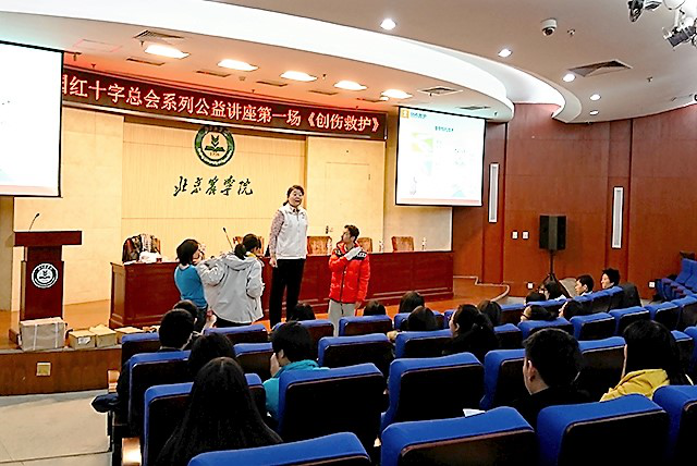 讲座开始,王凯主任讲述急救的基本概论、救护的基本程序和原则。其中,她强调救护的基本原则是需要评估个人救护能力进行救护的,不然就会增加麻烦,得不偿失。然后,她讲到了科学救助的具体方式方法。她强调,科学救助需要根据伤情救助,并注意了解伤者受伤过程且采取相应止血的措施。讲述过程中,王凯主任播放视频,不仅指出视频中的错误,还做出正确的示范,让同学们更加直观的了解到急救的方法。最后,王凯主任让同学们上台,亲自演示三角巾的包扎技术,使同学们获益匪浅。