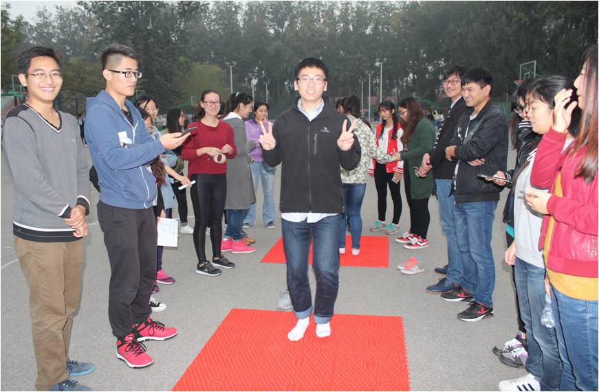 一旁进行的趣味运动也是精彩纷呈。魔鬼趾压板给了双脚一次充分的刺激,在随心所欲刷步数的同时,放松的不只是双脚还有心灵。“呼啦圈过山车”项目需要束缚双手在队员之间传递呼啦圈,需要团队通力合作。配合默契的小组就显得游刃有余。