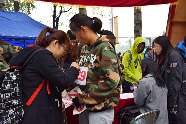桌子上面摆设:号码牌、急用的医药箱以及必备的饮用水。williamhill官方网站院旗在风中飘扬,而一个个带着袖标的志愿者,让人在远处也很容易找到,这就是植科服务站。