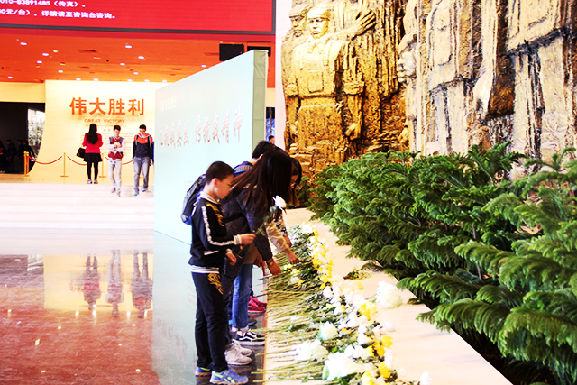 在纪念馆负责人的引领下,同学们一起向先烈献花,表达了对他们深深的怀念和钦佩之情。随后,同学们参观纪念馆,看到展馆内再现的中国人民14年浴血抗战的历史画面,想到中华儿女冒着敌人炮火共赴国难,英勇抗日的辉煌历史,同学们的内心是复杂的,既憎恶当时日本人对中国人的残害,又自豪中国人在当时艰苦的条件下取得了抗日的胜利。那一幅幅生动的图片,一张张真实的图表,一件件古朴的实物,一段段澎湃的视频,着力展现中国人民抗日战争取得伟大胜利的历史意义。