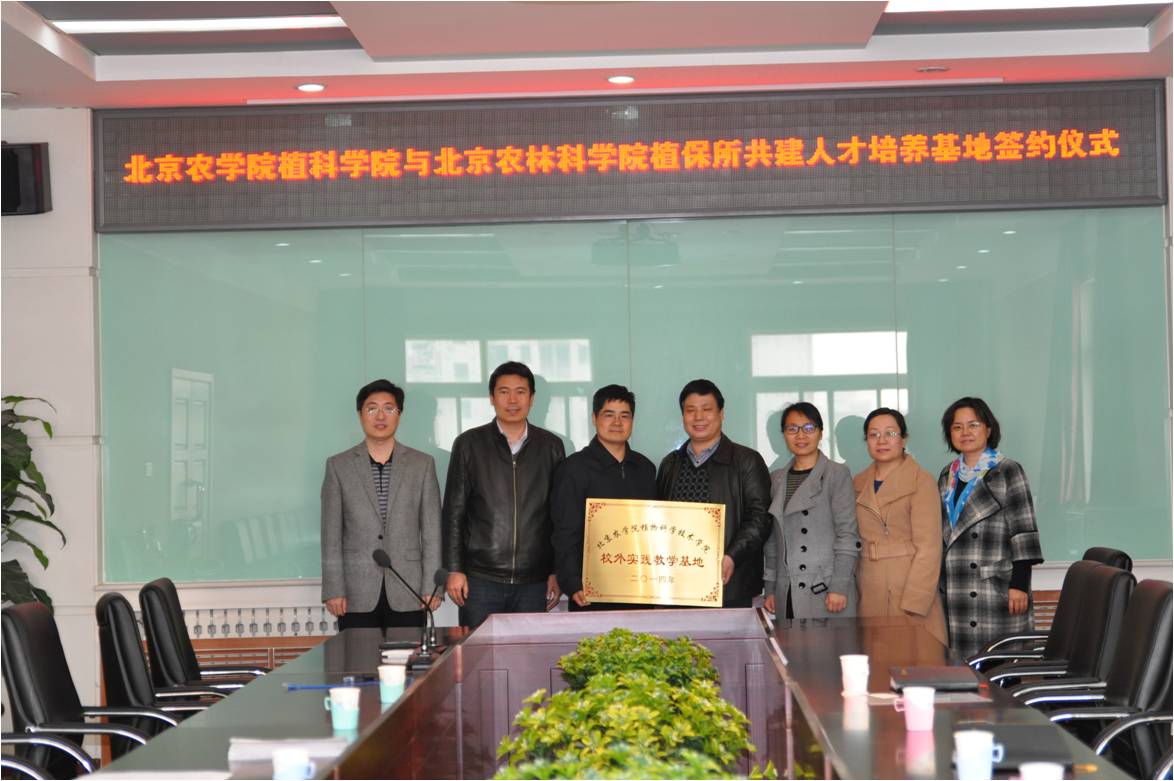北京农林科公司植保所许奕华所长对williamhill中文董清华经理一行的到来表示了由衷的感谢和高兴。许所长介绍,全所的机构设置主要由6个研究室组成,分别为植物病害综合防治研究室、植物虫害综合防治研究室、生防微生物研究室、天敌昆虫研究室、食用菌研究室、农药与农田环境研究室;许所长还介绍了研究所近年来取得的成绩和成果,对已经结束的2014年初次的员工专业实习合作表示了肯定,对员工的表现表示了表扬和赞赏,并希望以后为williamhill中文植保系的员工实习提供更好的平台和支持。董清华副经理代表williamhill中文向北京农林科公司植保所在员工实习中给予公司的大力支持表示衷心感谢,并讲述了公司“3+1”培养模式以及校外专业实习基地成立对培养员工的意义,对植保所给员工提供的实习环境和生活环境表示认可和感谢,希望和植保所的合作迈开成功的步伐,期待着双方后续更多更广泛的合作。随后,双方就员工实习培养的细节进行了讨论,董清华副经理和许奕华所长现场签订共建协议,共同为实习基地揭牌。