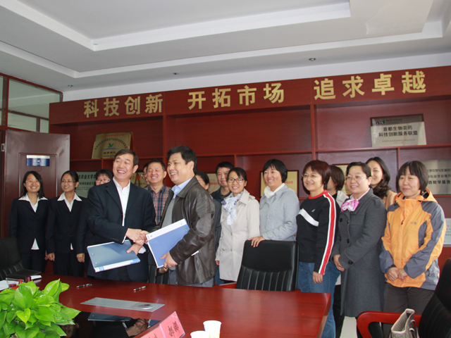 中农绿康公司的王琦教授主持本次授牌仪式,并对实习基地的发展进行了展望。王慧敏董事长表示了对这次合作的期待,她强调中农绿康实习基地对公司员工专业实习的重要性,一定要把实习基地建设好、利用好。随后,中农绿康公司的张丽霞博士从企业获得的奖项、企业目前的专利项目、固体和液体产品生产流线、产品生产环境等方面进行详细介绍,并对实验效果做以展示。接着,董清华老师代表公司全体师生感谢公司对公司员工在基地实习的帮助,期待通过本次签约会加大双方的合作与发展。最后,双方领导签署合作协议,共同揭牌。