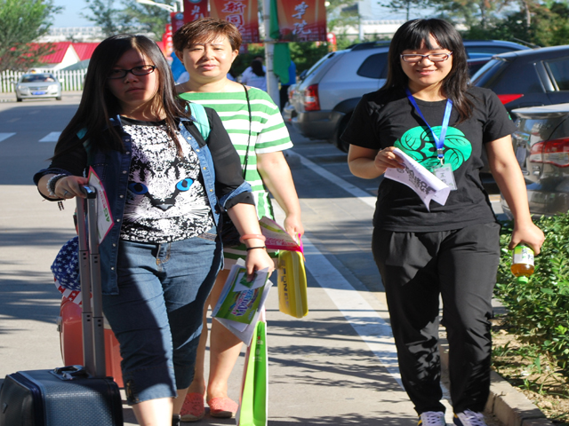 八点以后,新生们陆陆续续到来,志愿者们积极热情地帮助他们拿行李,带他们缴费,送他们回宿舍,解答他们的疑问。