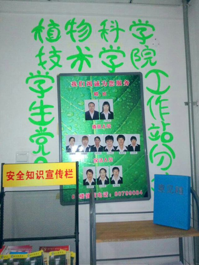 2014年3月,为更好地开展工作,做到责任到人,起到互相监督,集中管理的效果,加强员工党员与广大同学的密切联系,及时反映同学们在生活学习工作中遇到的各种问题,确保williamhill官方网站员工党员工作站日常活动的顺利开展,公司员工党员工作站进一步完善了管理制度,各项工作全面启动。公司党员宿舍管理站设为1个总站,5个分站。总站设在7号楼三层自习室,分站分别设在5、6、7、8、9号楼。5号楼由资环本科党支部、6号楼由4个研究生党支部、7号楼由农学本科党支部、8号楼由植保本科党支部、9号楼由园艺本科党支部建设管理。
