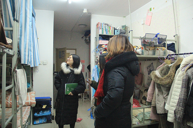 2018年12月29日下午1点,公司党总支副书记牛奔老师、团委书记郝娜老师、辅导员贾慧敏、杨韫嘉两位老师,走访抽查了员工公寓七、八、九号楼。
