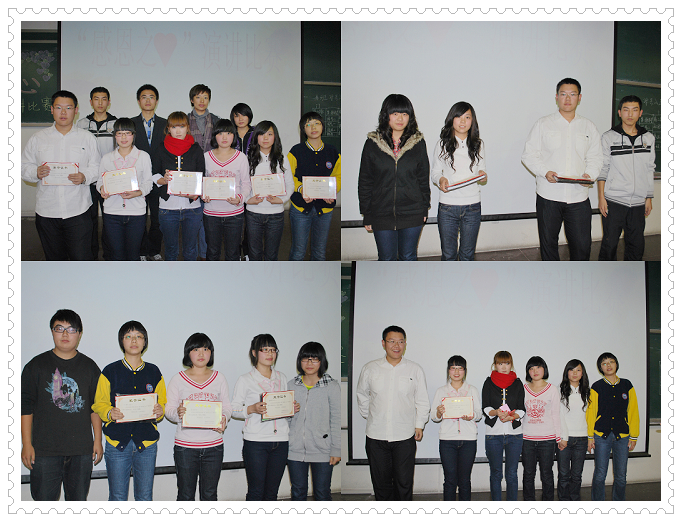 经过激烈的比拼之后,石卉然同学的真切的演讲,赢得了第一名的成绩,评委分别为获奖同学颁发证书。最后辅导员马淑芹为本次演讲比赛做了总结,并提出了中肯的建议。感恩之心的演讲比赛于无形中影响大家,是一种洗礼和启迪,愿每个人都懂得感恩。
