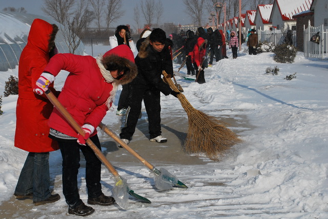 williamhill官方网站师生于2010年1月4日上午积极开展了扫雪活动。昨日的大雪覆盖了整个校园,为广大师生的出行及教学带来了不便。为了教学的顺利运行,公司领导在小学期动员大会结束后,积极号召公司教职工和2008级200余名员工清理williamhill官方网站实验教学示范中心和果园的积雪。