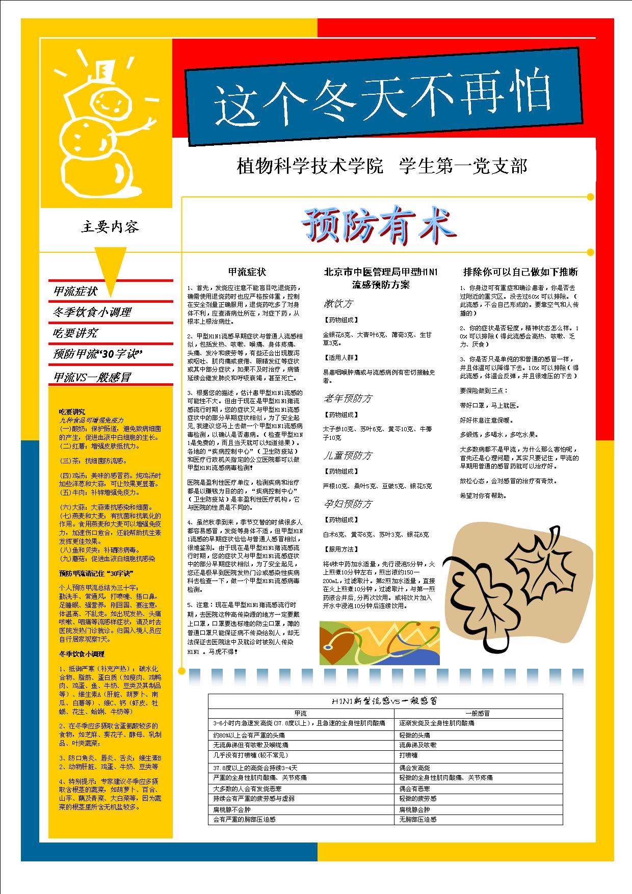 此次宣传主体内容为“预防有数”介绍了甲流的相关症状,并将其与一般感冒症状相区分,便于师生直观的对自己及身边的情况进行区分和加以判断以做到及时的预防和治疗。再有就是人性化的“冬季饮食小调理”和“吃要讲究” 等生活化的内容。其中介绍了几种可增强免疫力的日常食品,并介绍了符合冬季人体特点的饮食搭配,能够帮助大家将身体机能调整到最佳状态,以更好的投入日常的生活、工作、学习中去。与此同时我们也着力宣传了一些基本的预防甲流的方法,并推出“预防甲流30字诀”的版块,以纠正自身日常生活习惯,正真做到预防为主。宣传的另一内容便是“北京市中医管理局甲型H1N1流感预防方案”其中对不同年龄断的人群及老年、儿童、孕妇等弱势群体的预防方法做了介绍。