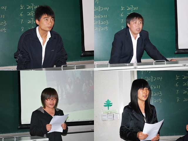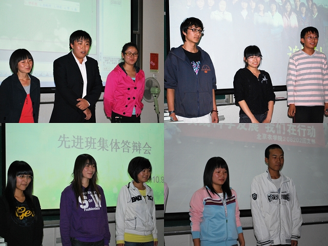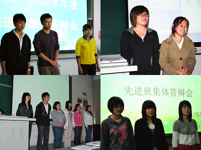 答辩会由院员工会主席齐岩主持,马淑芹、贾慧敏、邬瑞杰三位老师及各班负责人担任评委,先进班集体评选活动主要从政治思想、道德品质、心理健康、学习成绩、工作效果、语言表达等几个方面进行评比。通过初选的2006-2008级8个竞选班的班委以演讲、幻灯片、视频展示等方式展现本班一年来的风采,并回答了评委老师的提问,以表达本班级团结进取的决心,充分展示出同学们努力拼搏、热爱集体的良好风尚。