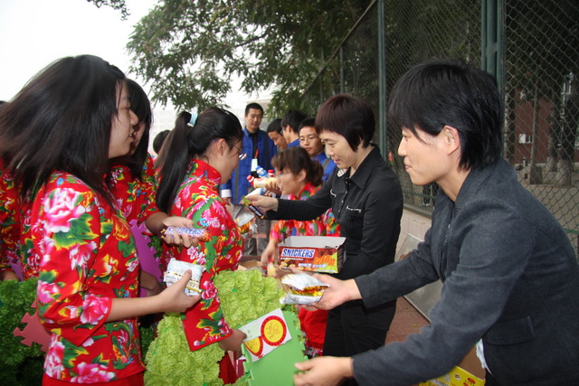 考虑到参加训练的师生体力消耗较大,在大家出发之前,院领导亲自为同学们发放慰问品,大家心里感受着公司领导的关怀,决心要以最大热情投入到国庆庆典日的表演当中,高质量完成任务,为公司争光、为公司争光、为祖国争光。