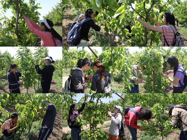 当天抵达目的地后,果园的吴经理热情接待了大家。休息片刻后,吴经理开始简单介绍了阳光果园的发展和现状,之后走进梨园,进行现场疏果技术指导。天气虽然很热,但大家听得很认真,遇到修剪的重点和注意问题,有的同学会记录在本子上,对于不清楚的操作细节,同学们也都抓紧时间向老师和吴经理请教。待吴经理讲解完毕,便分发剪刀,2人一组,行动起来,每组的任务是完成一排将近60株的疏果工作。