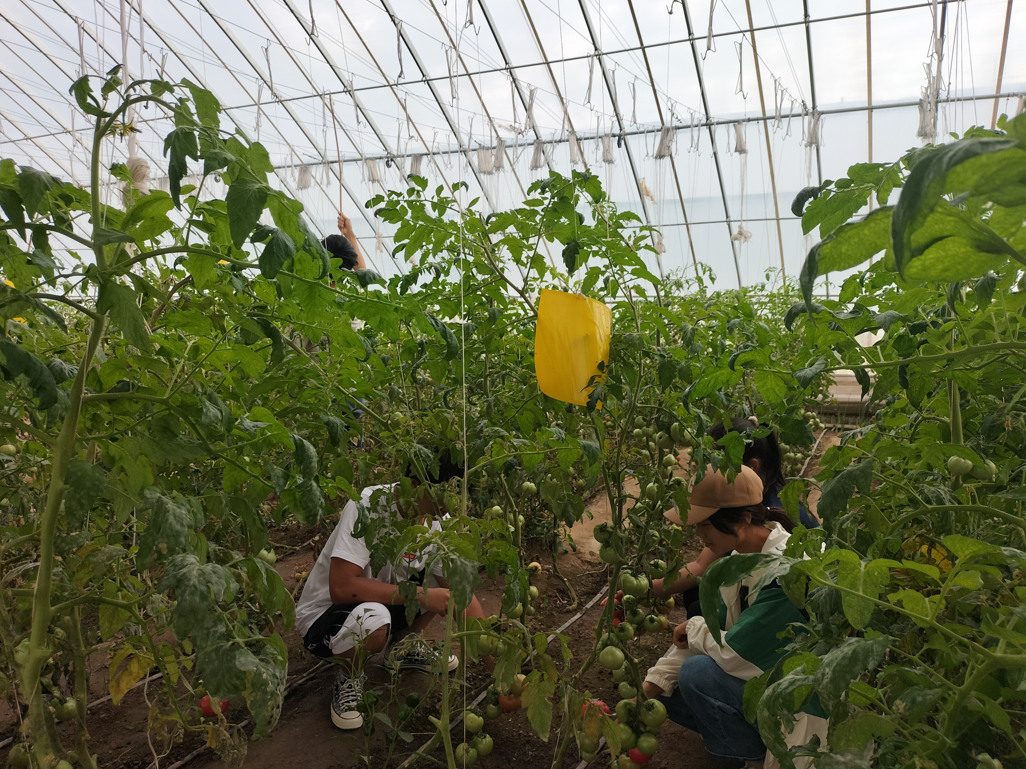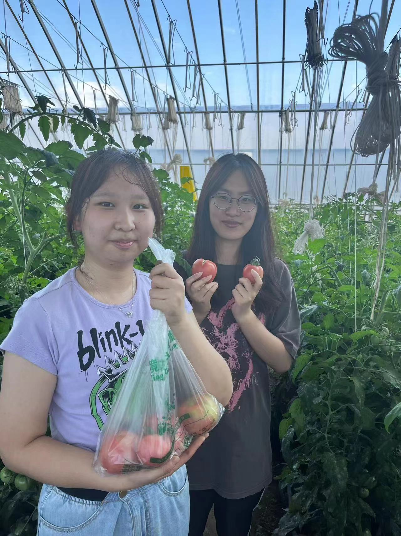 镜头一转,在东大地大棚内,22级园艺专业的同学们也正俯身菜畦间,幸福地收获着自己亲手种植的黄瓜和西红柿。一粒小小的种子,一颗瘦弱的幼苗,在同学们灌溉、吊蔓、打杈的悉心照料下,如今终于迎来硕果累累的丰收盛景。同学们的脸上洋溢着最纯真质朴的笑容,捧着嫩绿的黄瓜,火红的番茄,丰收的喜悦也在此传递。