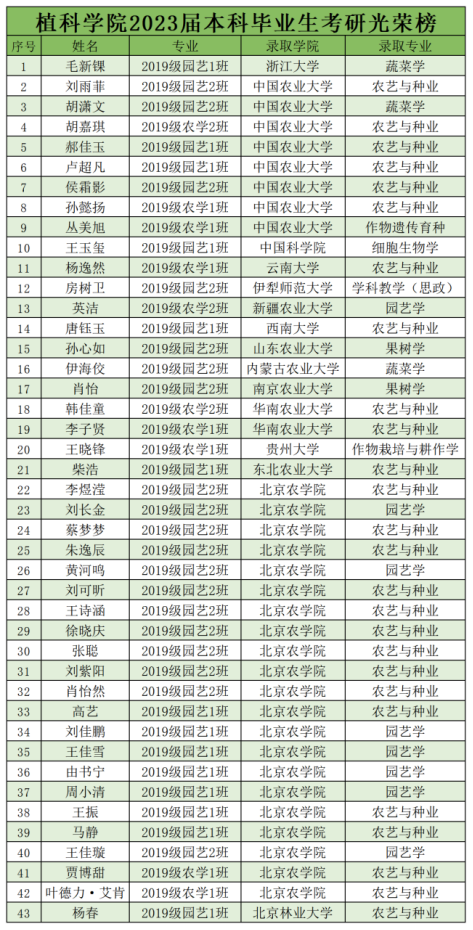 williamhill官方网站2023届本科毕业生131人,考研上岸人数43人,其中985院校上岸9人,涉及浙江大学、中国农业大学;211院校上岸6人,涉及北京林业大学、贵州大学、西南大学、南京农业大学、云南大学、东北农业大学;双一流院校2人,涉及华南农业大学等院校。千淘万漉虽辛苦,吹尽狂沙始到金。祝贺2023届考研学子取得佳绩,愿大家在今后的学习生活中继续努力,乘风破浪,未来可期。