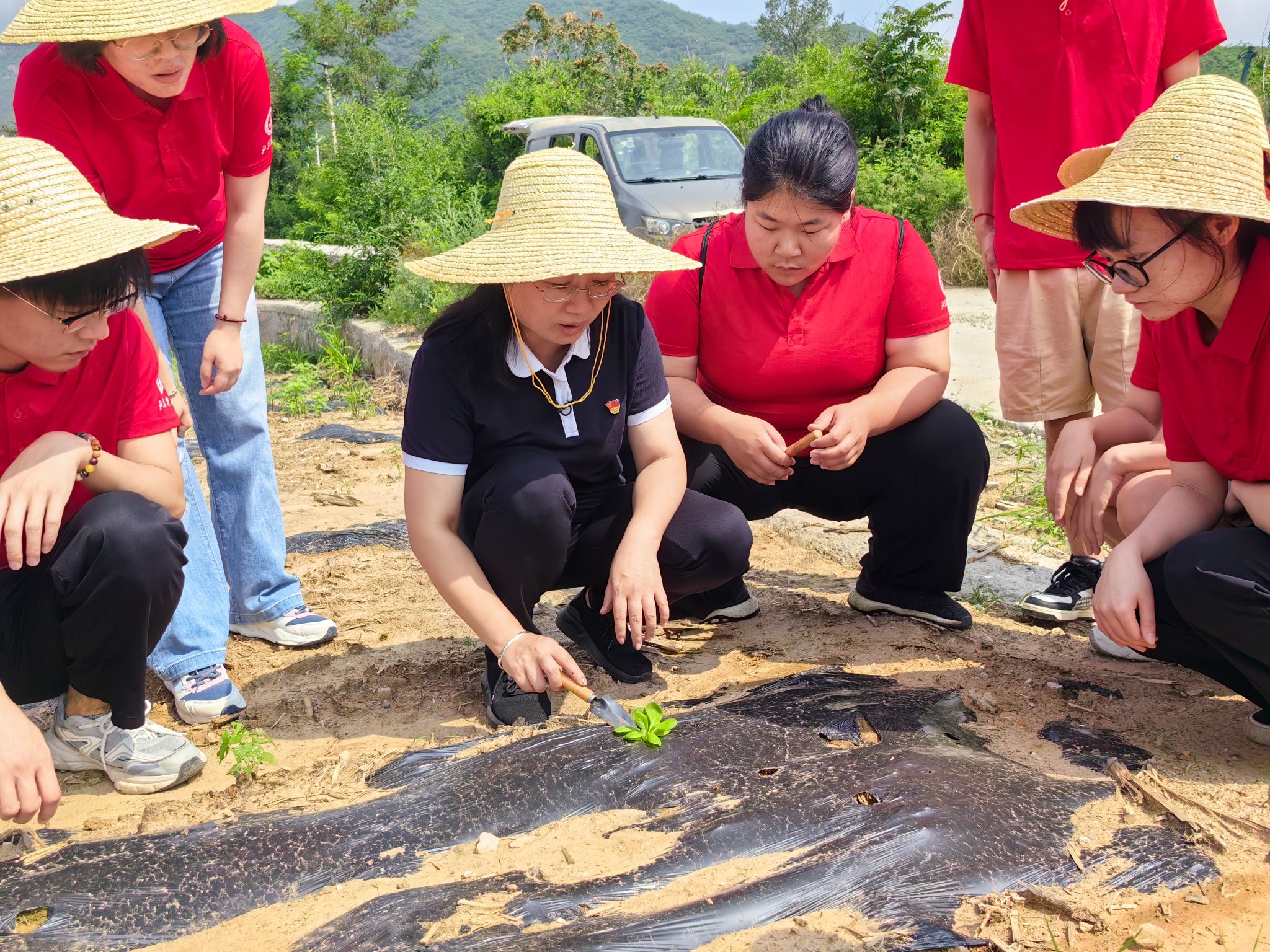 在韩莹琰教授的带领下,实践团在溜石港村北山坡梯田开展生菜科学移栽,在确保株行距和定植深度合理范围内,将绿色散叶生菜和紫色散叶生菜定植到梯田。