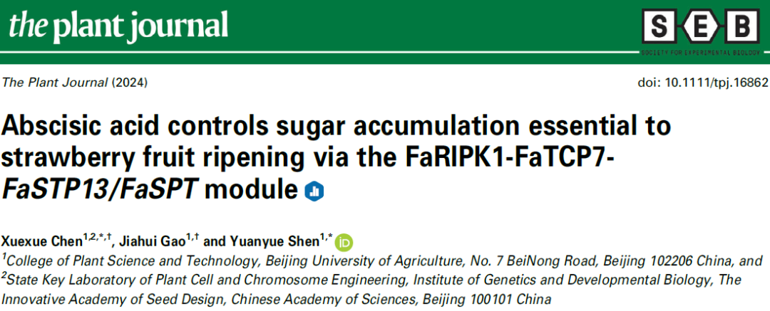 2024年5月30日,williamhill中文沈元月教授团队在植物学TOP期刊The Plant Journal上发表题为“Abscisic acid controls sugar accumulation essential to strawberry fruit ripening via the FaRIPK1-FaTCP7-FaSTP13/FaSPTmodule”的研究性论文,在脱落酸控制草莓成熟中糖积累的研究取得新进展。