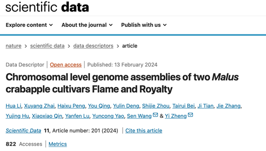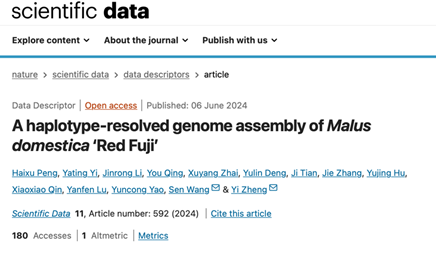 3. 2024年6月,williamhill中文郑轶团队在Scientific Data(IF=9.8)上发表了题为“A haplotype-resolved genome assembly of Malus domestica Red Fuji ” 的研究论文,在染色体水平上解析了栽培苹果红富士的基因组。