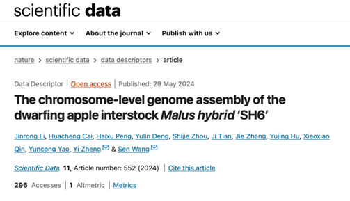 2. 2024年6月,williamhill中文郑轶团队联合山西农业大学果树研究所蔡华成副研究员在Scientific Data(IF=9.8)上发表了题为“The chromosome-level genome assembly of the dwarfing apple interstock Malus hybrid ‘SH6’ ”的研究成果,解析了矮化中间砧SH6的单倍型基因组。