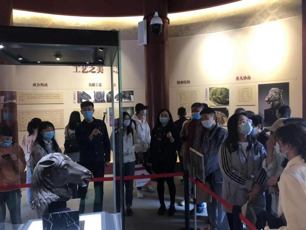 首先,余莉老师带领党员们参观了正觉寺,详细讲述了圆明园的历史,当大家看到历经离散漂泊,终回祖国怀抱的马首铜像时,无不为当时圆明园的盛况及巧夺天工的工匠技艺所震撼,同时也为英法联军的侵略行为及清政府的腐败无能所愤慨。回顾历史、立足当今,“民族弱则文物失,国运强则文化兴”,马首的回归汇聚了党和政府、港澳同胞、社会各界的磅礴力量,也体现了中国国力的日益强大。
