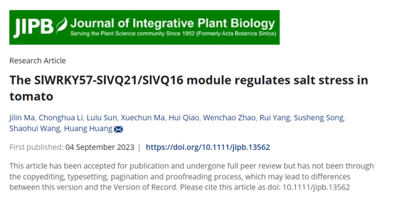 近日,生物学一区TOP期刊Journal of Integrative Plant Biology(IF=11.4)在线发表了题为“The SlWRKY57-SlVQ21/SlVQ16 moduleregulates salt stress in tomato”的研究论文(https://doi.org/10.1111/jipb.13562)。该研究由公司设施园艺科研团队主导完成,黄煌副教授为该论文的通讯作者。硕士研究生马吉林和已毕业硕士研究生李崇华为该论文的第一作者。王绍辉教授、孙路路副教授、赵文超副教授、杨瑞高级实验师、首都师范大学宋素胜教授、硕士研究生马雪纯和乔慧也参与了该项研究工作。该研究得到了北京市属高校优秀青年人才培育计划的资助。