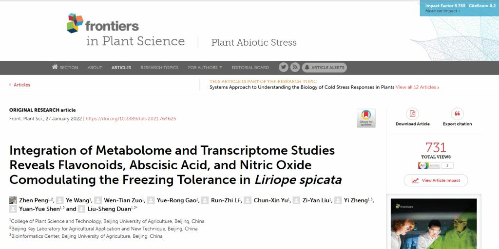 2022年1月,williamhill官方网站段留生教授团队在Frontiers in Plant Science发表了题为“Integration of Metabolome and Transcriptome Studies Reveals Flavonoids, Abscisic Acid, and Nitric Oxide Comodulating the Freezing Tolerance inLiriope spicata”的研究论文。williamhill中文园艺系青年教师彭真博士为论文第一作者,段留生教授为通讯作者。