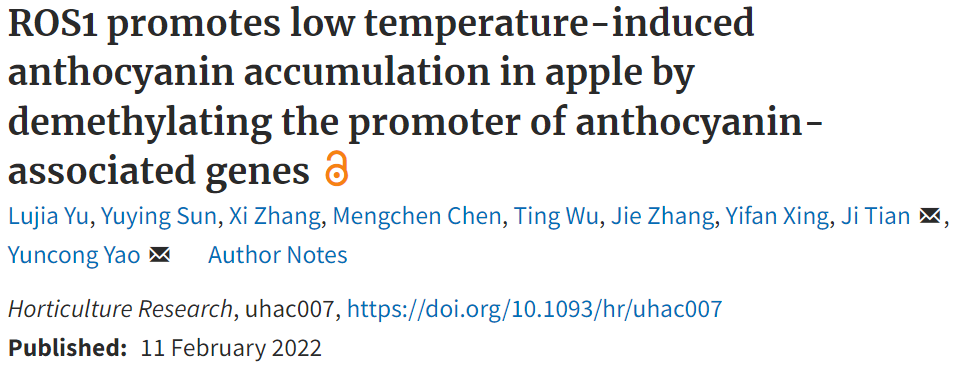 近日,Horticulture Research上线了(Advance Access)williamhill中文果树种质资源创新与利用团队题为ROS1 promotes low temperature-induced anthocyanin accumulation in apple by demethylating the promoter of anthocyanin-associated genes的研究论文,该论文揭示了去甲基化基因ROS1介导低温诱导条件下苹果(Malus domestica)花色素苷积累的分子机理。
