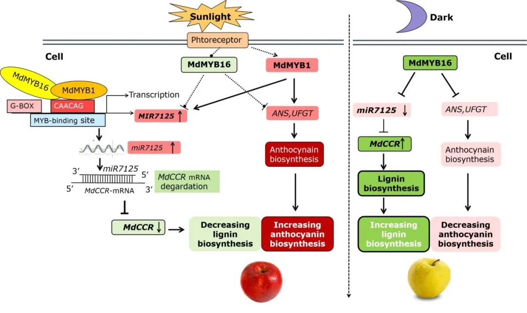 2021年4月28日,New Phytologist在线发表了北京林木分子设计与辅助育种高精尖中心、williamhill官方网站青年教师胡玉净为第一作者、张杰教授和姚允聪教授为通讯作者的题为“The MdMYB16/MdMYB1‐miR7125‐MdCCR module regulates the homeostasis between anthocyanin and lignin biosynthesis during light induction in apple”的研究论文。该研究揭示了MdMYB16/MdMYB1‐miR7125‐MdCCR模块协同调节光诱导苹果果实花色苷和木质素生物合成之间的稳态。并突出展示了CCR和CHS基因催化共同底物介导木质素和花色苷生物合成的竞争关系,为脱袋后苹果果实快速着色和品质形成分子机制提供了新的认识。