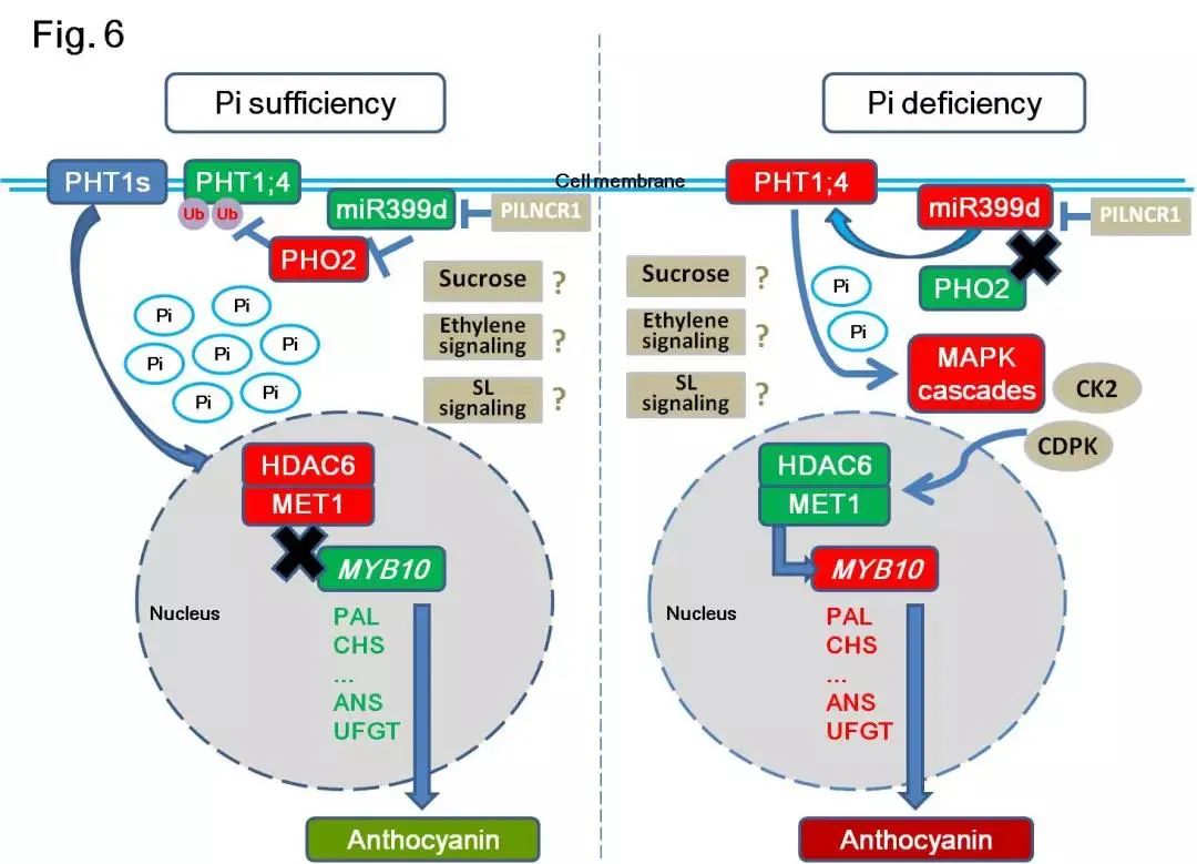 2019年12月13日,Plant Cell and Environment杂志在线发表了williamhill中文姚允聪课题组题为“MiR399d and epigenetic modification comodulate anthocyanin accumulation in Malus leaves suffering from phosphorus deficiency”的研究论文。该研究揭示了miR399d、HDA6和MET1共同调控的苹果属叶片缺磷胁迫下花色苷积累的分子机制。