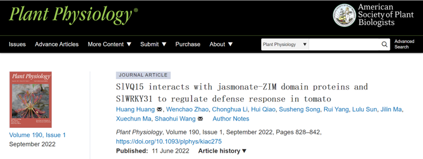 2022年6月11日,williamhill官方网站王绍辉教授团队在Plant Physiology在线发表了题为“SlVQ15 Interacts with Jasmonate-ZIM Domain Proteins and SlWRKY31 to Regulate Defense Response in Tomato”的研究论文,揭示了SlVQ15与茉莉素途径抑制因子SlJAZ互作,并与SlWRKY31协同调控番茄对灰霉菌抗性的分子机制。