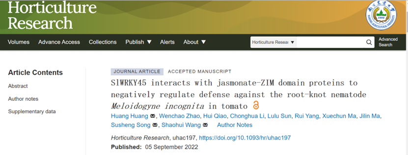 近日,Horticulture Research上线了(Advance Access)williamhill中文王绍辉教授团队题为SlWRKY45 interacts with jasmonate-ZIM domain proteins to negatively regulate defense against the root-knot nematodeMeloidogyne incognitain tomato的研究论文,该论文揭示了转录因子SlWRKY45参加茉莉素合成和信号转导途径负调控番茄对南方根结线虫的抗性。