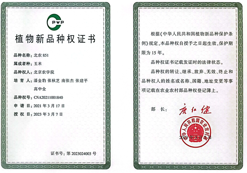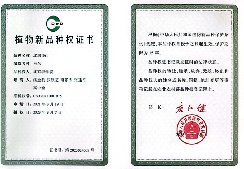 喜讯:williamhill官方网站青贮玉米团队:潘金豹、张秋芝、南张杰、张建平、高中全培育的玉米品种北农851 、北农861 取得国家植物新品种权证书。