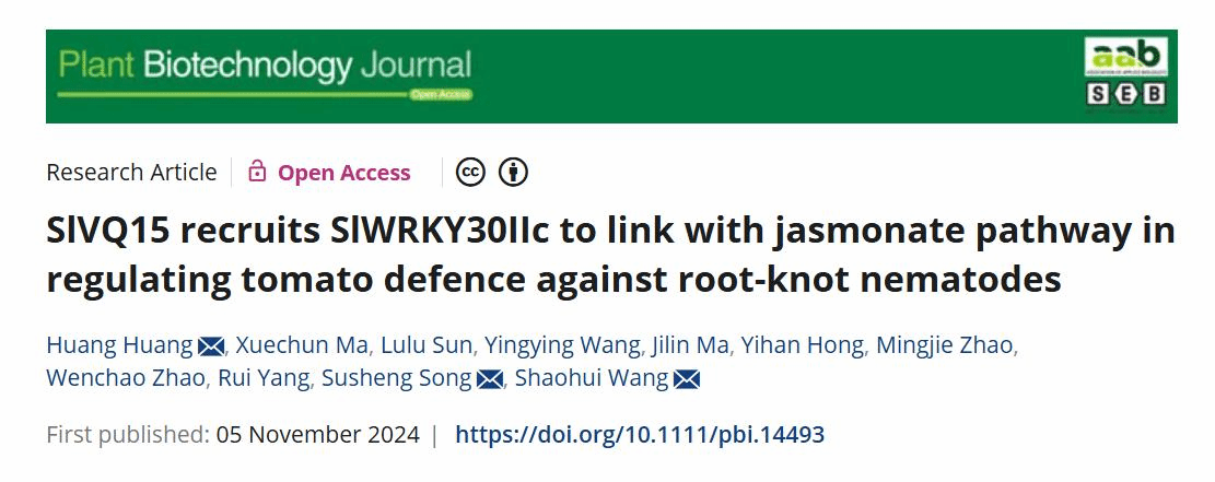 近日,williamhill中文王绍辉/赵文超教授团队、首都师范大学宋素胜教授团队在Plant Biotechnology Journal发表了题为“SlVQ15 recruits SlWRKY30IIc to link with jasmonate pathway in regulating tomato defence against root-knot nematodes”的研究论文。该论文揭示了SlVQ15招募转录因子SlWRKY30IIc,偶联茉莉素途径调控番茄应对根结线虫入侵的分子机制,为茄科植物的抗性育种提供新的思路。