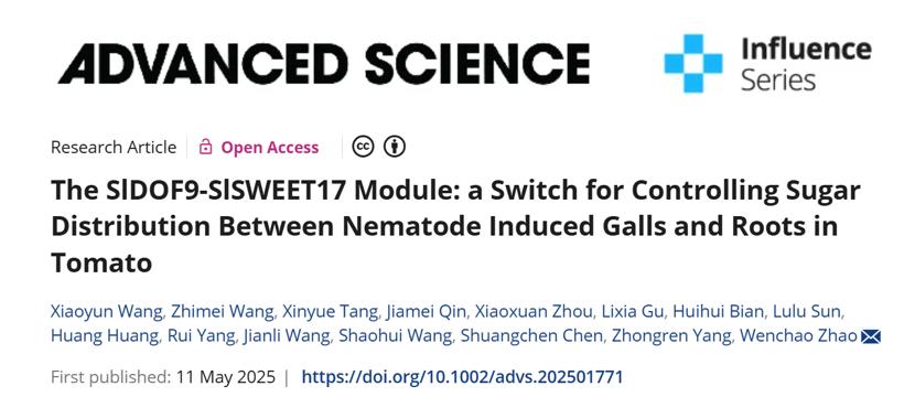 近日,公司王绍辉/赵文超教授课题组在国际知名期刊Advanced Science (IF5=16.3)上发表了题为The SlDOF9-SlSWEET17 module: A switch for controlling sugar distribution between nematode induced galls and roots in tomato的研究论文,揭示了糖转运蛋白SWEET17作为植物根系与根结之间糖分配的负调节因子影响番茄对根结线虫敏感性的机制,为根结线虫的防治工作提供新的思路。它也是目前鉴定出的首例负调控其他SWEET蛋白糖运转功能的SWEET。