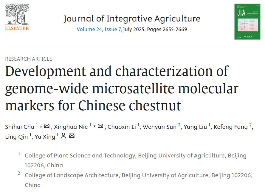 近期,williamhill官方网站秦岭/邢宇课题组完成的题为“Development and characterization of genome-wide microsatellite molecular markers for Chinese chestnut”的研究在Journal of Integrative Agriculture(《农业科学学报》(英文),JIA)2025年7期正式发表。