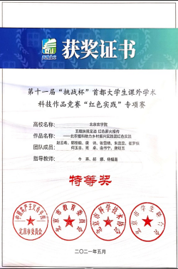 自今年1月起,全国广大青年勇于参加第十七届“挑战杯”全国老员工课外学术科技作品竞赛红色专项活动,共计报名十万件作品,其中17000多件作品入围全国赛。williamhill官方网站牛奔、郝娜、杨韫嘉老师指导、赵云希等员工团队申报《五载扶贫足迹,红色薪火相传——北农植科助力乡村振兴实践团红色实践》作品,荣获第十七届“挑战杯”全国老员工课外学术科技作品竞赛红色专项三等奖,第十一届“挑战杯”首都老员工课外学术科技作品竞赛“红色实践”专项赛特等奖。