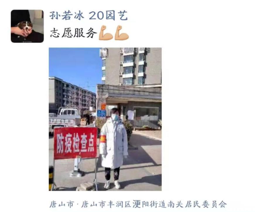 “做逆行者的第二天,也不记得自己今天爬了多少楼,通知了多少人家,贴了多少封条。数九寒冬,羽绒服外边裹着防护服,汗水把羽绒服都浸透了,但仍旧收获感动。”——19级王嘉腾