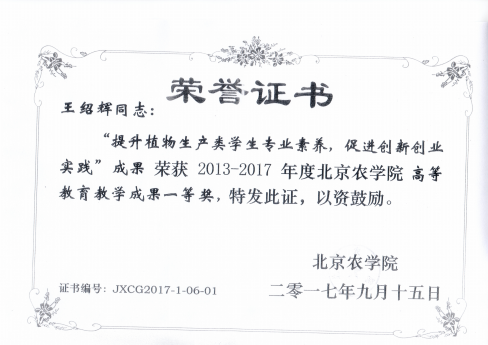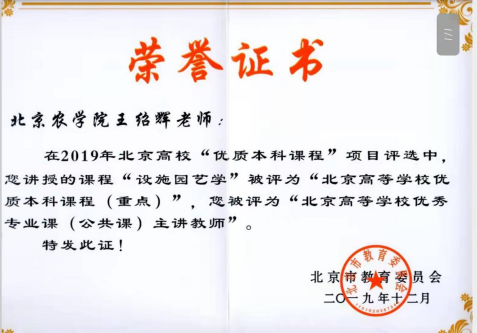 团队的骨干课程《设施园艺学》2019年获得北京高等高校优质本科课程(重点)项目、2021年获北京高校课程思政示范课程、教学团队;课程负责人被评为“北京高等公司优秀专业课(公共课)主讲教师”,获得“北京高校课程思政示范课程名师”称号。