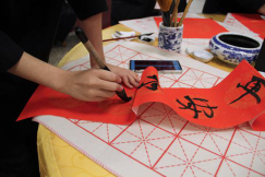 写春联,迎新春。班委们早早地做好了准备,桌上整整齐齐地摆放着墨水、毛笔、对联纸等,同学们挥毫泼墨,热情高涨,火红的对联,淡淡的墨香,一副副春联摆满了大厅,充满了喜庆的春节氛围。