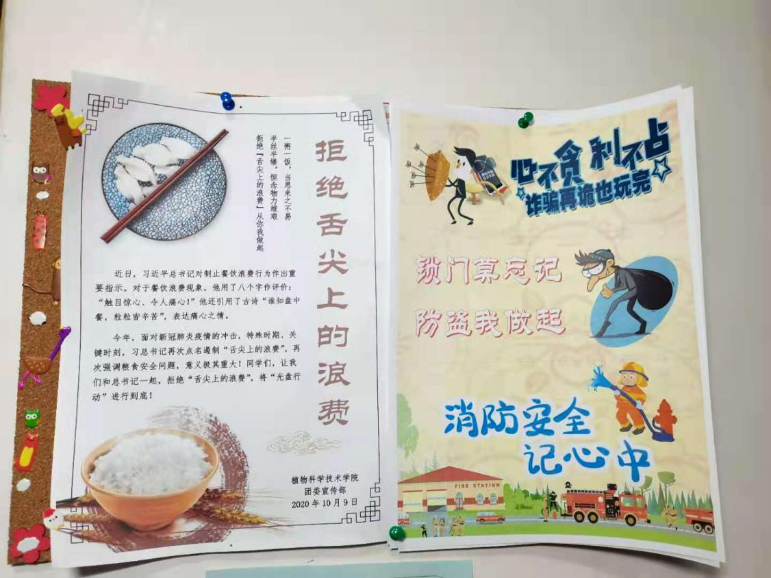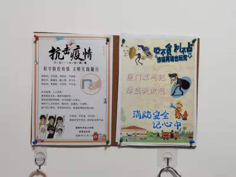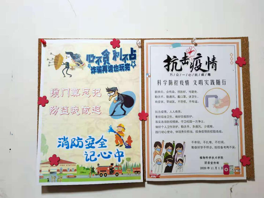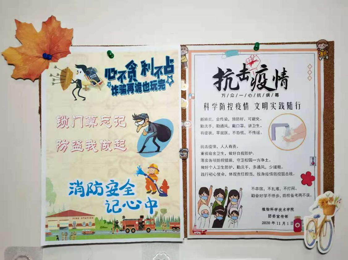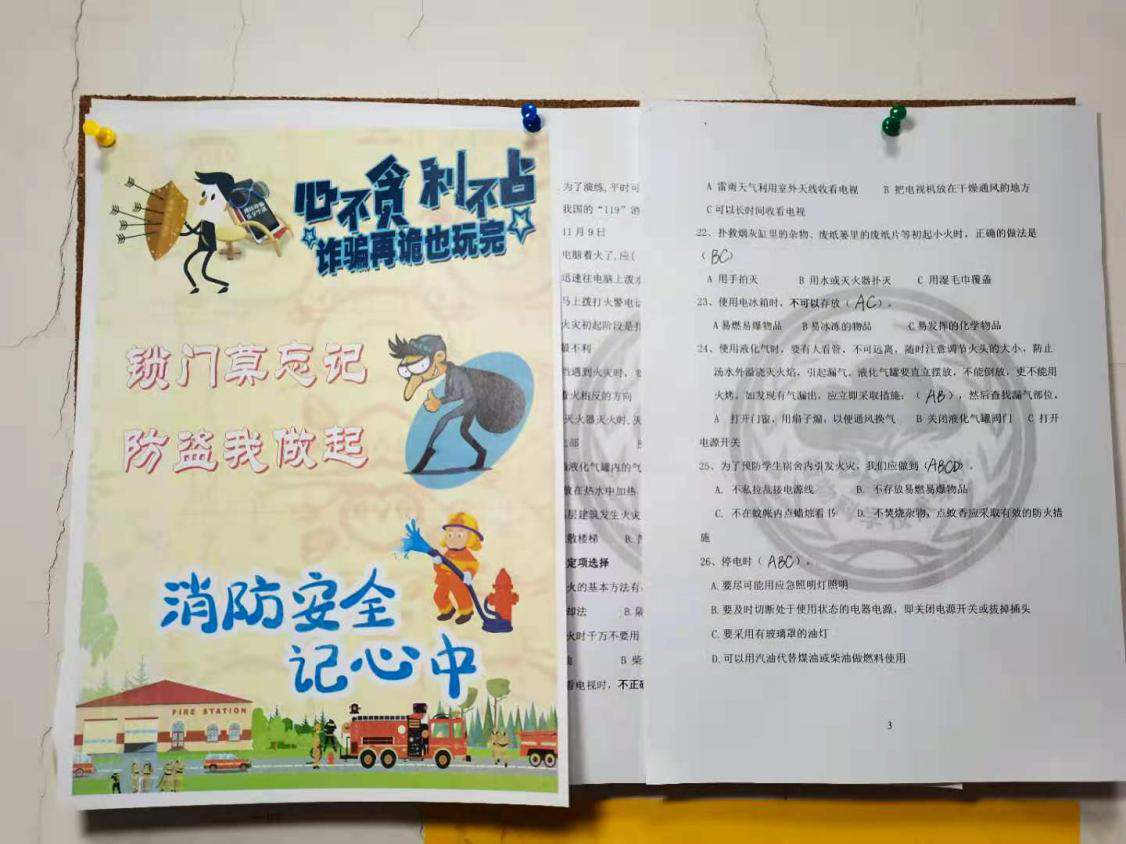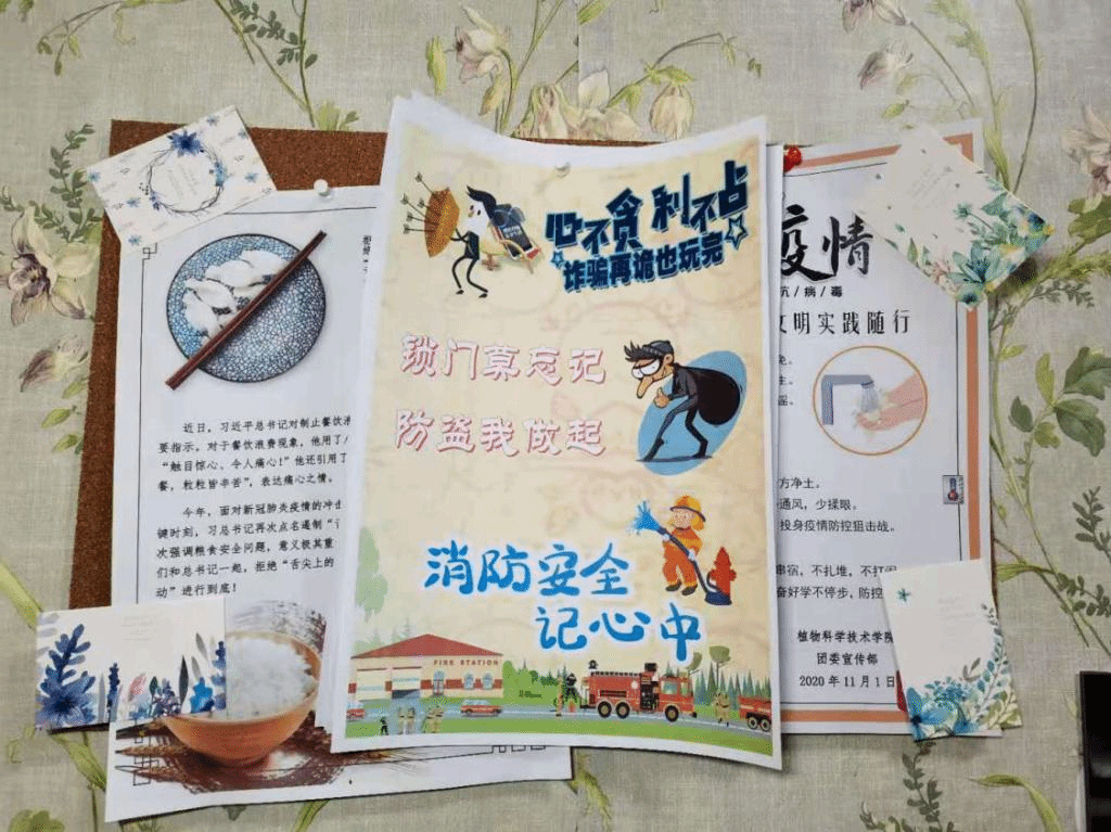 此次活动由团委宣传部成员统一制作了宿舍宣传板海报,主题为“放火防盗防诈骗”。主题鲜明的海报潜移默化的使同学们树立起“生命至上、安全第一、预防为主、防消结合”,“保护私有财产,增强防盗意识”和“高警惕,多防范,少轻信,勿上当”的思想。