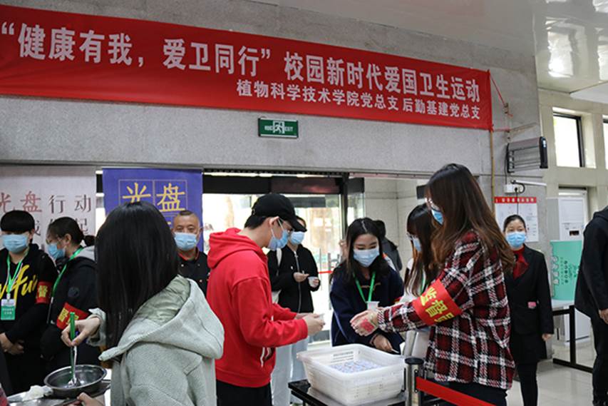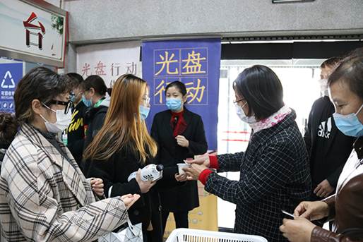 仪式上,后勤基建党总支书记张秋芝、公司党总支书记王绍辉共同张贴“校园新时代爱国卫生运动光盘行动——保护环境从我做起”宣传海报,分别为志愿者们颁发志愿监督员与工作牌,志愿者与领导们在横幅下合影,光盘行动正式启动。