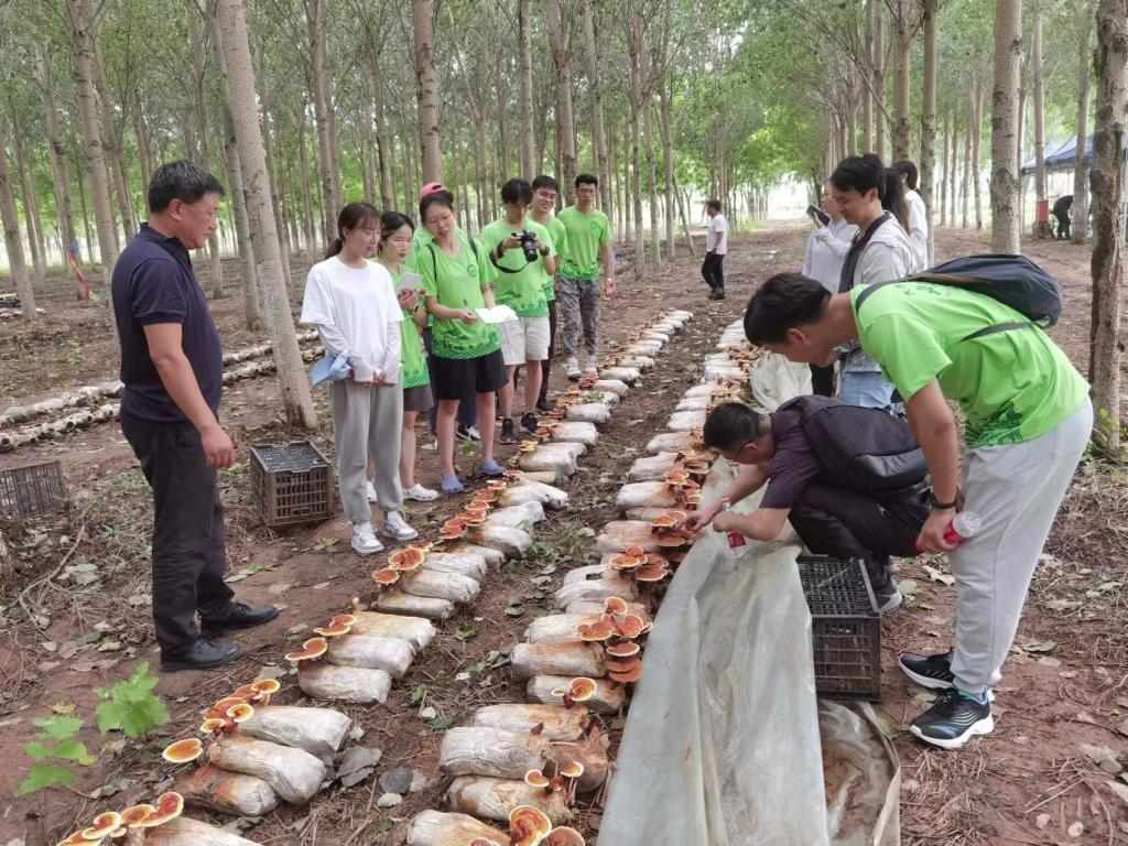 下午实践团实地考察了农业生态园,并观察林下食用菌栽培情况,包括灵芝、赤松茸、黑鸡枞、榆黄菇、平菇等。园区内除食用菌基地外还拥有丰富的农业资源以及旅游资源,部分农业旅游景观规划已初见雏形。同时在考察过程中,园艺学教授张国庆、副教授刘超杰、对花卉品种选择、种植养护以及园区内水地协调提出专业建议,同时建议园区产业建设可与亲子互动活动相结合,实现第一产业与第三产业的融合发展。