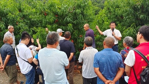 为提升大桃夏季管理水平,实践团专业教师针对大华山镇大桃夏季栽培管理和病虫害防治存在的问题开展实用技术培训。williamhill官方网站果树专家张卿和王志忠结合大桃主干型和开心形树形讲解大桃夏季管理的技术要点,建议大桃种植户要抓住大桃花芽分化的关键时期,通过夏季整形修剪改善树体结构和调控营养分布,提高花芽分化质量,为第二年的优质高产奠定基础。植保专家魏艳敏和郭洪刚分别针对大桃夏季病害和虫害进行详细讲解,重点培训了大桃细菌性黑斑病、穿孔病、炭疽病、流胶病和梨小食心虫、蚜虫、蜗牛等病虫害的绿色防控技术。为优质精品大桃高标准生产提供依据,实践团师生在苏子峪大桃生产基地取土壤样品,并带回实验室测定土壤有机质和矿质元素含量。全镇30余名大桃种植户参加培训并表示,本次培训针对性、目的性和实用性强,内容贴近生产实践,措施可行易操作,收获很大。