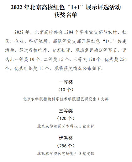 2022年,北京市委教育工委组织开展了北京高校红色“1+1”党支部共建活动。活动启动后,williamhill官方网站积极响应,顶层设计,扎实推进活动开展,及时总结共建成果。园艺研究生1支部从1204个员工党支部中脱颖而出,荣获一等奖,园艺本科生1支部获评三等奖,园艺研究生3支部获评优秀奖。这是公司五年来第二次荣获北京高校红色“1+1”示范活动一等奖。